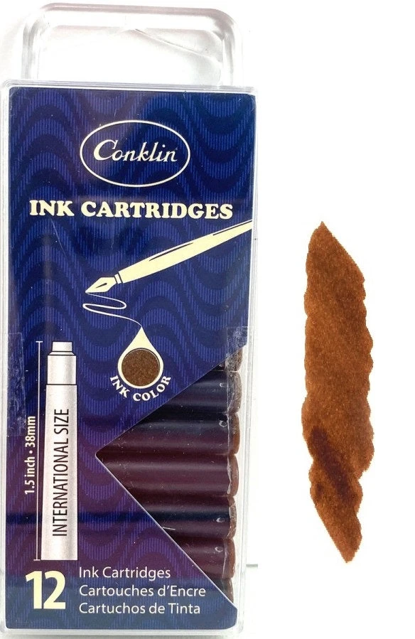 12 Conklin fountain pen ink cartridges that will fit any Conklin pen that utilizes a cartridge filling system.
