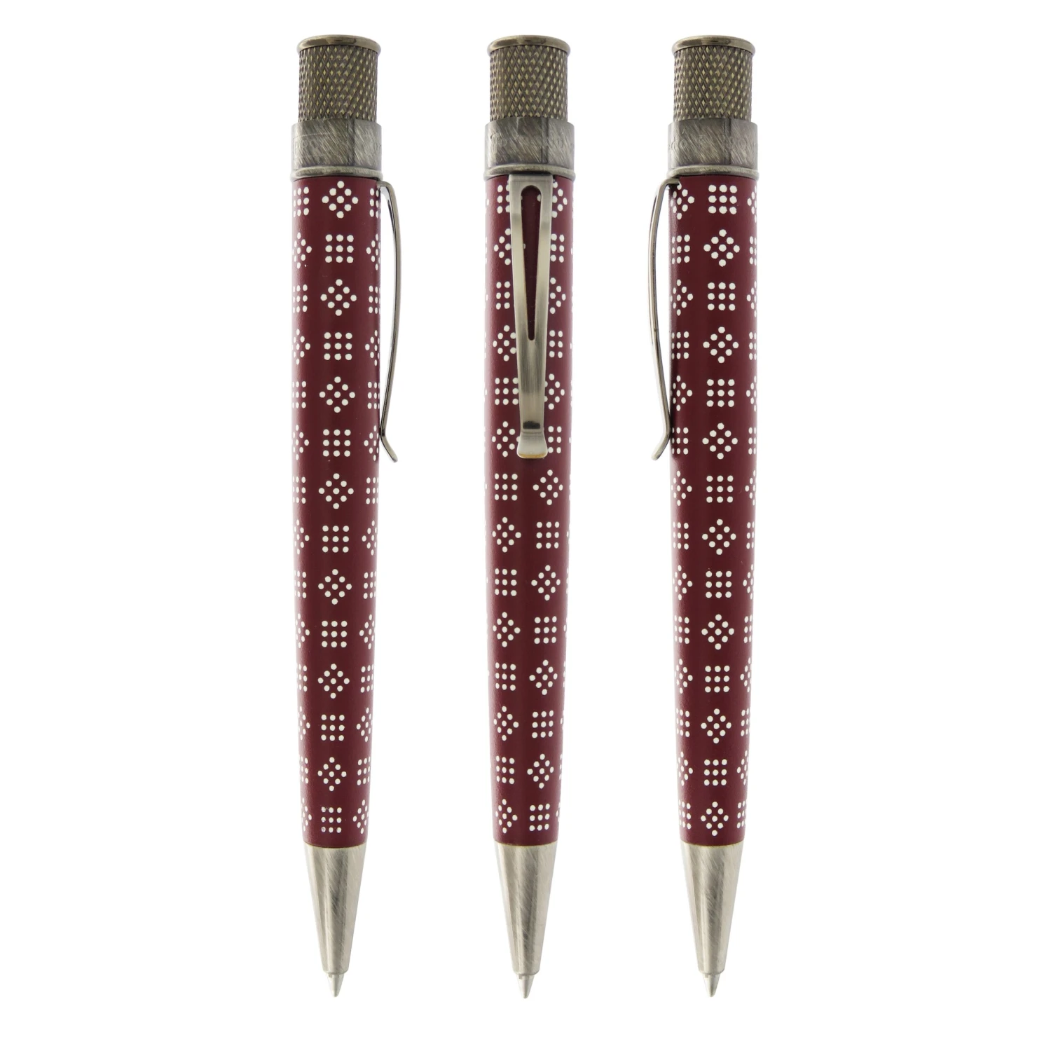 This Tornado rollerball pays homage to Harriet Tubman. The design reproduces the pattern from a headscarf in one of her most well-known photos. The stainless barrel has a lightly textured base coat with pattern printed on top and is finished with antique silver trim and her portrait on the finial.